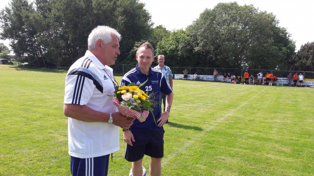 Im Bild zu sehen ist der Abschied von Florian Betz bei dem Vorsitzender Werner Ludwig (Hangenmeilingen) vor dem letzten Saisonspiel Florian Betz für seine vorbildliche Arbeit